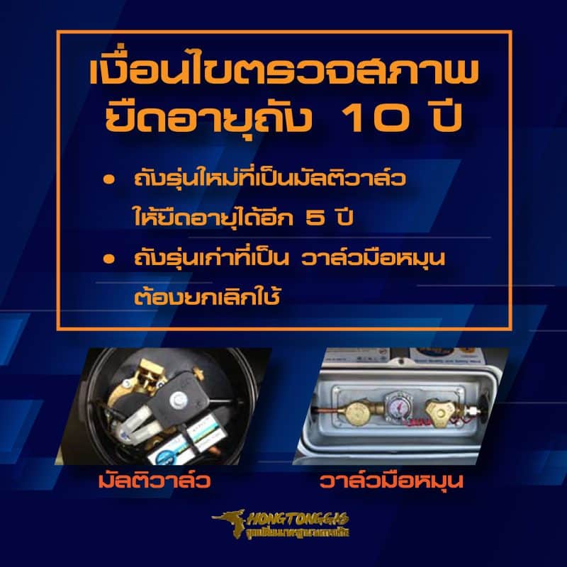 - ถังรุ่นใหม่ที่เป็น มัลติวาล์ว (วาล์วแบบวงกลม) สามารถยืดอายุได้ต่ออีก 5 ปี โดยวิศวกรสามารถตรวจและทดสอบ เพื่อออกใบรับรองในการยืดอายุถังต่อได้ 5 ปี