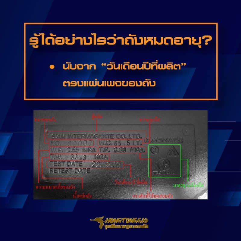สำหรับการดู “อายุของถังแก๊ส LPG” ให้นับจาก “วันเดือนปีที่ผลิต” แล้วบวกไปอีก 10 ปี รวมถึงรายละเอียดอื่น ๆ ซึ่งจะต้องถูกระบุไว้อย่างชัดเจนบนถังแก๊ส ดังภาพตัวอย่าง ได้แก่