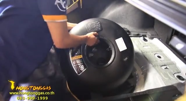 – ขณะที่มีช่างกำลังติดตั้งอุปกรณ์อยู่ที่ด้านหน้าหรือในห้องเครื่องยนต์ ช่างอีกทีมหนึ่งจะดำเนินการติดตั้งถังไปพร้อมๆ กันที่ฝากระโปรงหลัง โดยช่างจะนำแผ่นปิดยางอะไหล่และยางอะไหล่ออกก่อน เมื่อเคลียร์พื้นที่ด้านหลังเรียบร้อยแล้วจะใช้สว่างเจาะพื้นของที่วางยางอะไหล่เพื่อทำช่องติดตั้งหัวเติมแก๊สและเดินท่อแก๊สผ่านใต้ท้องรถ