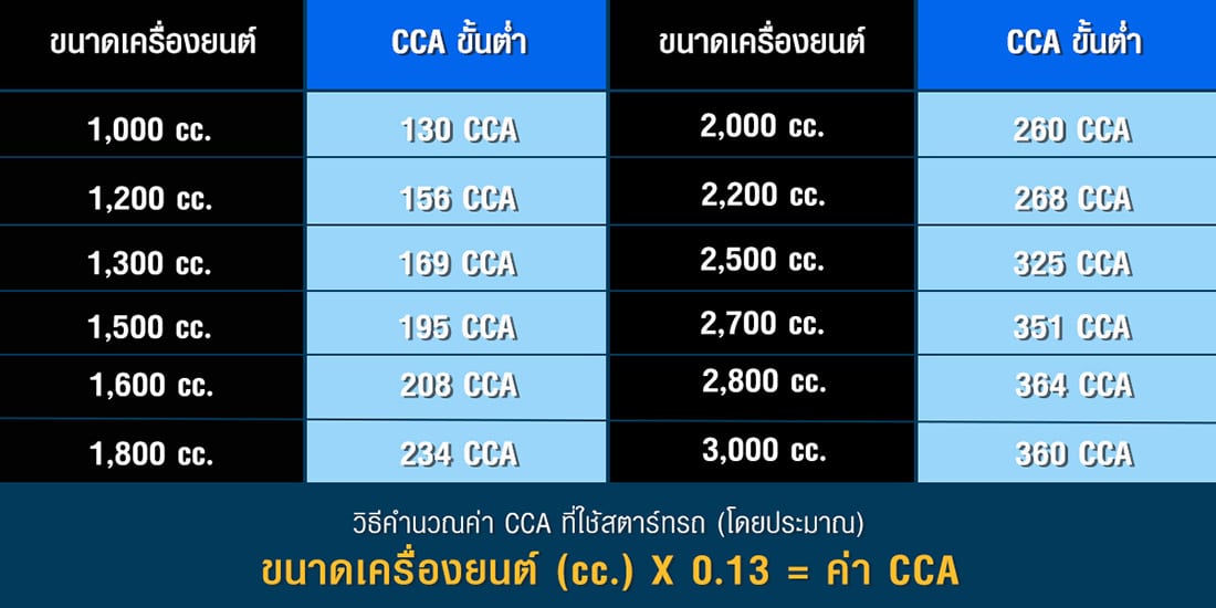 CCA (Cold Cranking Amp)หมายถึงความสามารถในการจ่ายกระแสไฟเพื่อสตาร์ทเครื่องยนต์ในสภาวะอากาศหนาว ยิ่งค่า CCA สูงแสดงว่าแบตเตอรี่มีกำลังสตาร์ทแรง ซึ่งโดยปกติในการเลือกใช้แบตเตอรี่รถยนต์ นอกจากดูค่าโวลต์ (Voltage : V)หรือแรงดันไฟฟ้า และค่าแอมป์-ชั่วโมง (Ampere Hour : Ah)หรือ ความสามารถในการจ่ายกระแสไฟแล้ว ควรดูค่า CCA ด้วย เพื่อให้ทราบถึงประสิทธิภาพการทำงานของแบตเตอรี่ เช่น แบตเตอรี่เก่า ค่า CCA ที่วัดได้จะลดลง เมื่อเทียบกับแบตเตอรี่ใหม่หรือเพิ่งชาร์จเต็ม *** สรุปว่า *** ค่า CCA บอกถึงกำลังไฟสำหรับการสตาร์ทเครื่องยนต์ แล้วรถยนต์แต่ละรุ่น CCA ต่ำสุดเท่าไหร่ในการสตาร์ท?สามารถคำนวณคร่าว ๆ ได้ ดังนี้
