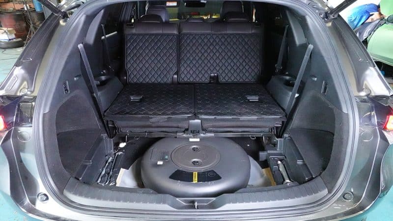 สำหรับ Mazda CX8 2.5 Skyactiv ติดแก๊ส ในส่วนของถังแก๊สซึ่งจะถูกติดตั้งไว้ที่ฝากระโปรงหลัง หลังจากวัดพื้นที่เรียบร้อยแล้ว ขนาดถังที่เหมาะสมสามารถวางในหลุมวางยางอะไหล่ได้อย่างลงตัวคือ ถังแก๊สขนาด 43 ลิตร การติดตั้งจะมีการรองแผ่นยางกันกระแทกและยึดถังอย่างแน่นหนา เมื่อติดตั้งเสร็จแล้วสามารถปิดฝาครอบยางอะไหล่กลับไปได้อย่างพอดี ไม่จำเป็นต้องทำฝาครอบเสริม ไม่เสียพื้นที่ในการวางสัมภาระแต่อย่างใด