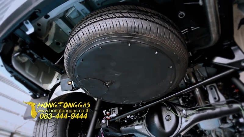 ถังโดนัทวางบน ในการออกแบบการติดตั้ง หลังจากวัดพื้นที่/ระยะห่างตามมาตรฐานแล้ว เราจะเลือกขนาดถังที่สามารถติดตั้งได้พอดี และนำมาติดตั้งไว้ที่ส่วนฝากระโปรงหลังในหลุมวางยางอะไหล่ พร้อมกับมีการรองแผ่นยางกันกระแทกและยึดถังอย่างแน่นหนา ข้อดีคือทำให้สามารถปิดฝาครอบหลุมยางอะไหล่กลับไปได้อย่างพอดี ช่วยประหยัดพื้นที่ใช้สอยในรถลูกค้า (ไม่เสียพื้นที่วางสัมภาระด้านหลัง)