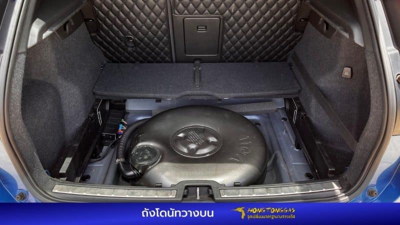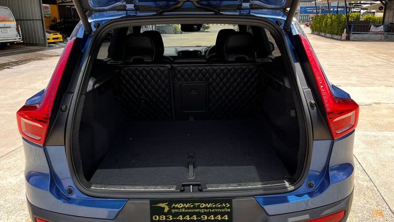 สำหรับ Volvo XC40 T5 ติดแก๊ส ในส่วนของถังแก๊สซึ่งจะถูกติดตั้งไว้ที่ฝากระโปรงหลัง หลังจากวัดพื้นที่เรียบร้อยแล้วสามารถวางในหลุมวางยางอะไหล่ได้อย่างลงตัว การติดตั้งจะมีการรองแผ่นยางกันกระแทกและยึดถังอย่างแน่นหนา เมื่อติดตั้งเสร็จแล้วสามารถปิดฝาครอบยางอะไหล่กลับไปได้อย่างพอดี ไม่จำเป็นต้องทำฝาครอบเสริม ไม่เสียพื้นที่ในการวางสัมภาระแต่อย่างใด
